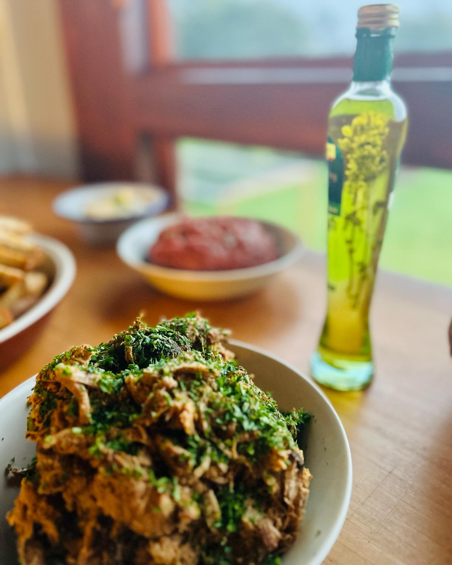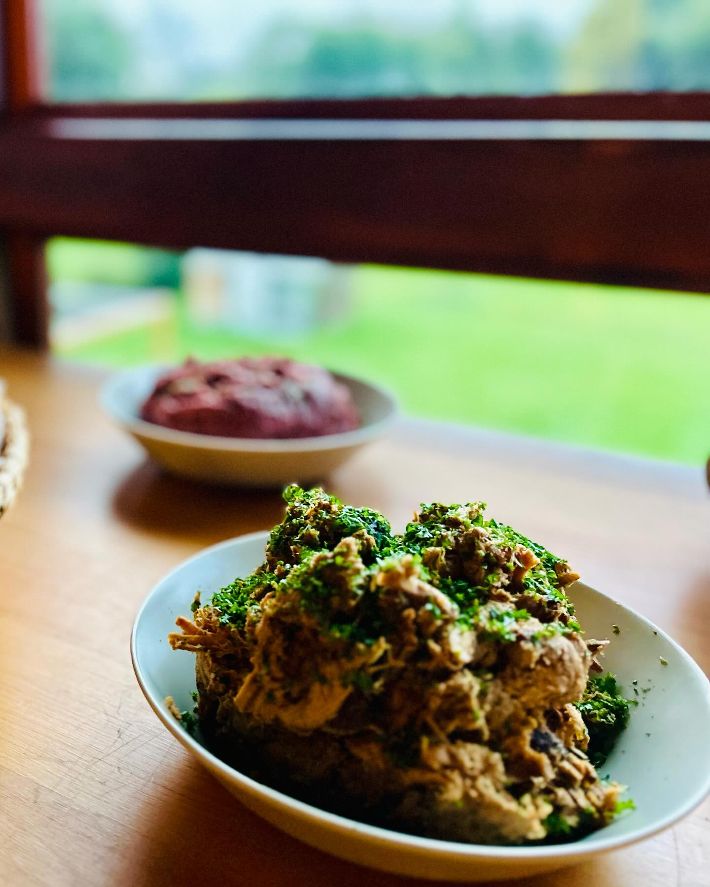 - Trhané vepřové maso, červená cibulka, slaninovo-bylinkový chléb