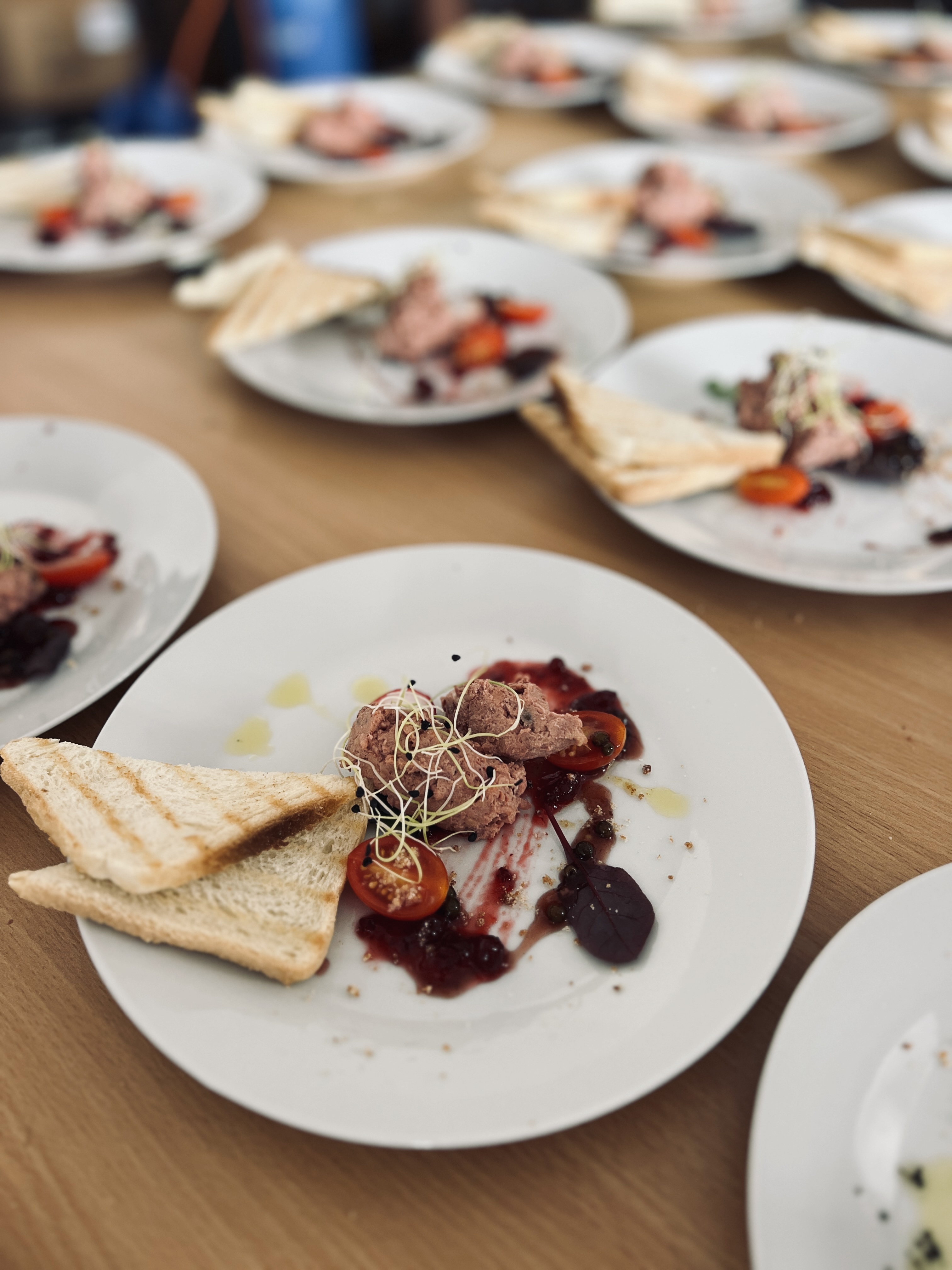 - Studený těstovinový salát s kuřecími prsíčky v bylinkách, domácí majonéza, čerstvá zelenina Bramborové placky s cibulovým chutney a uzenými kachními prsíčky