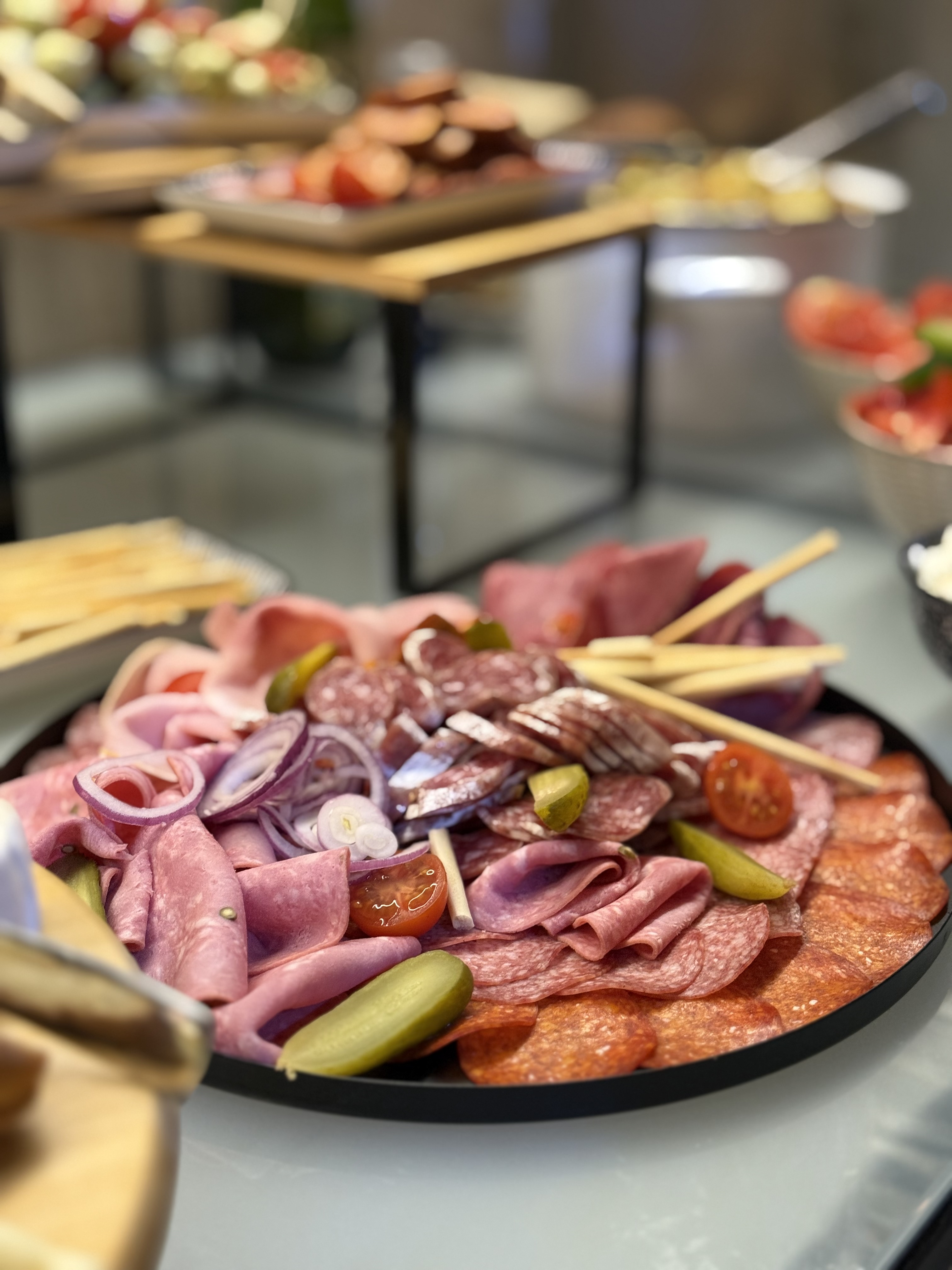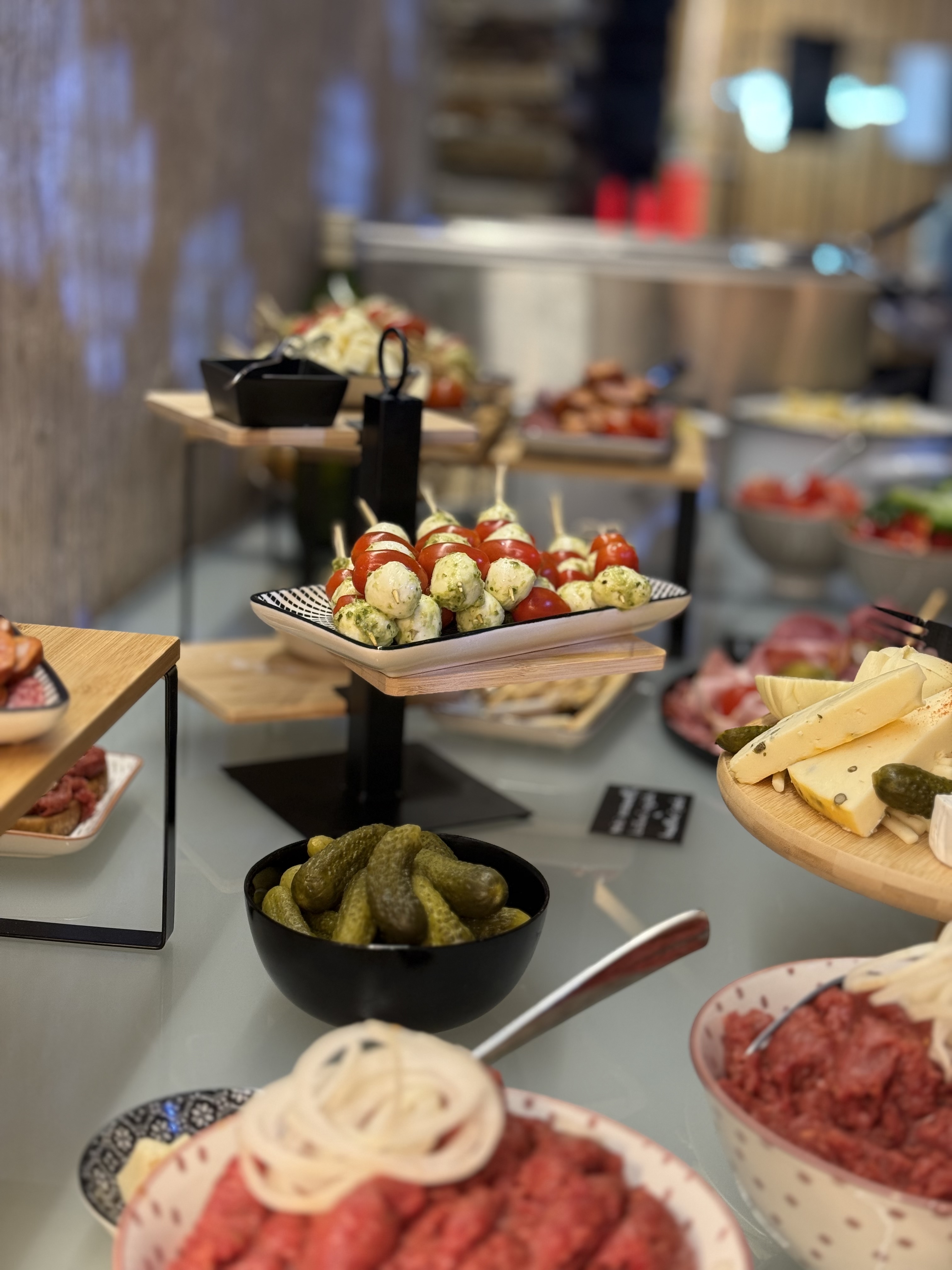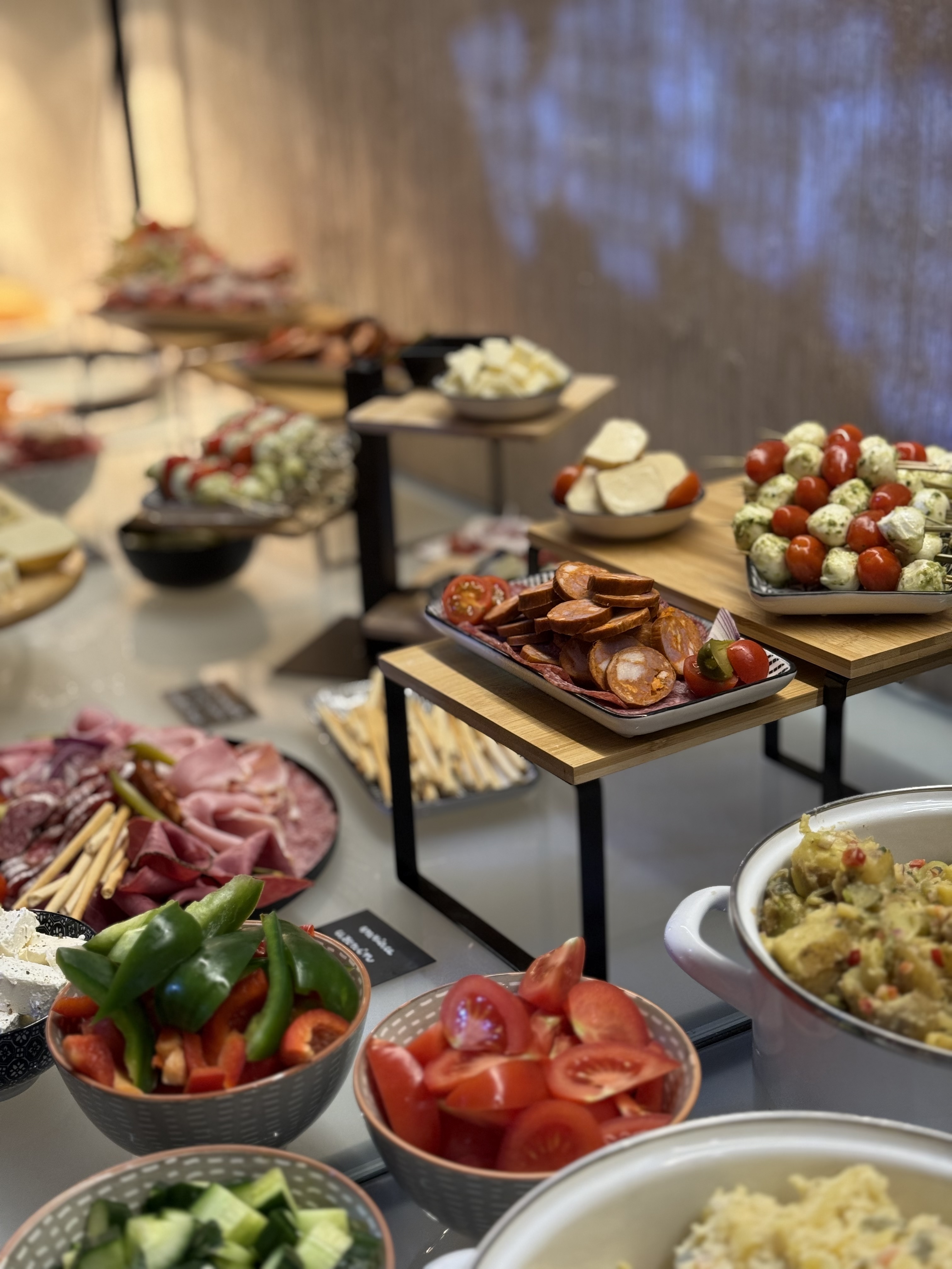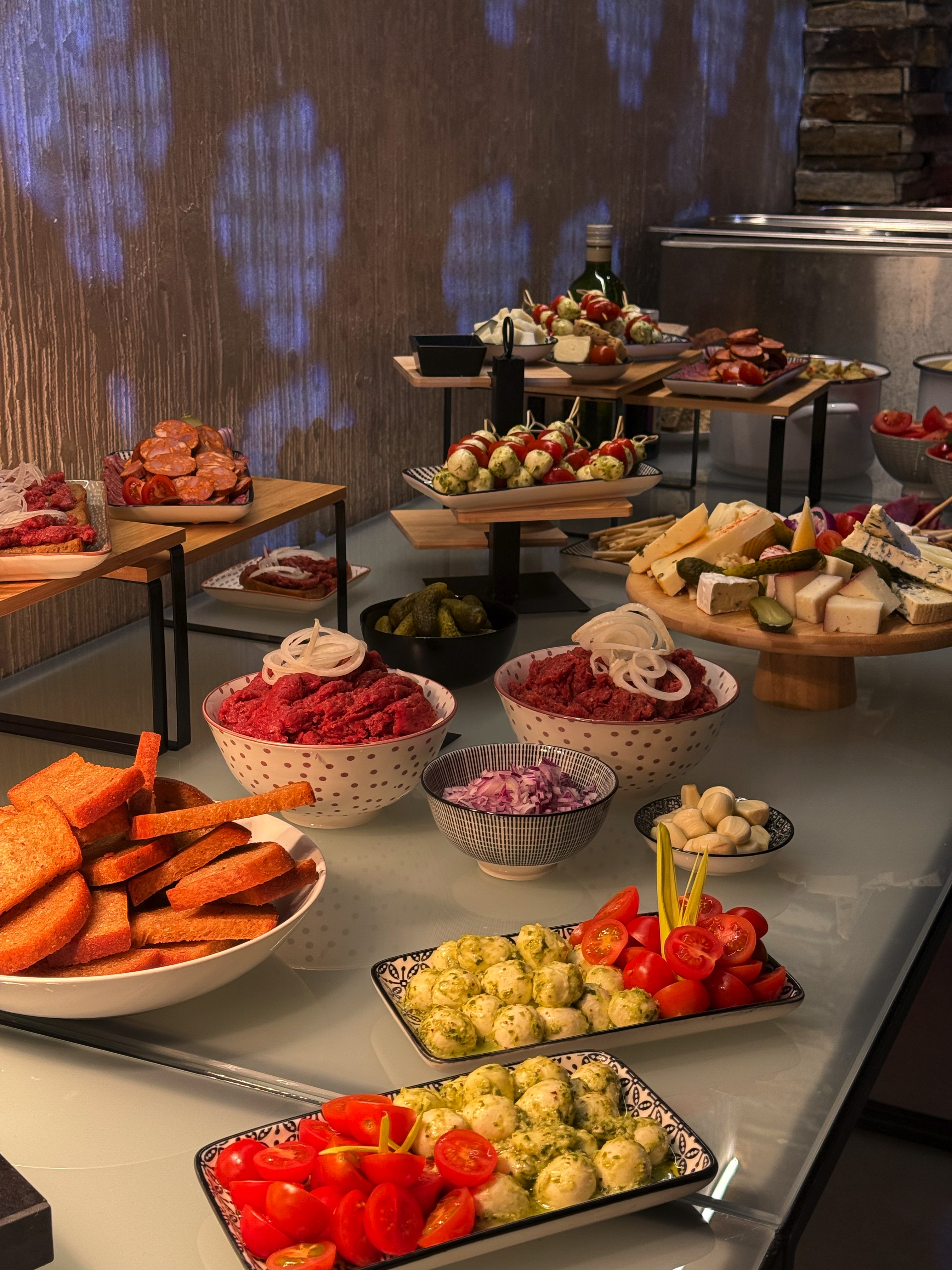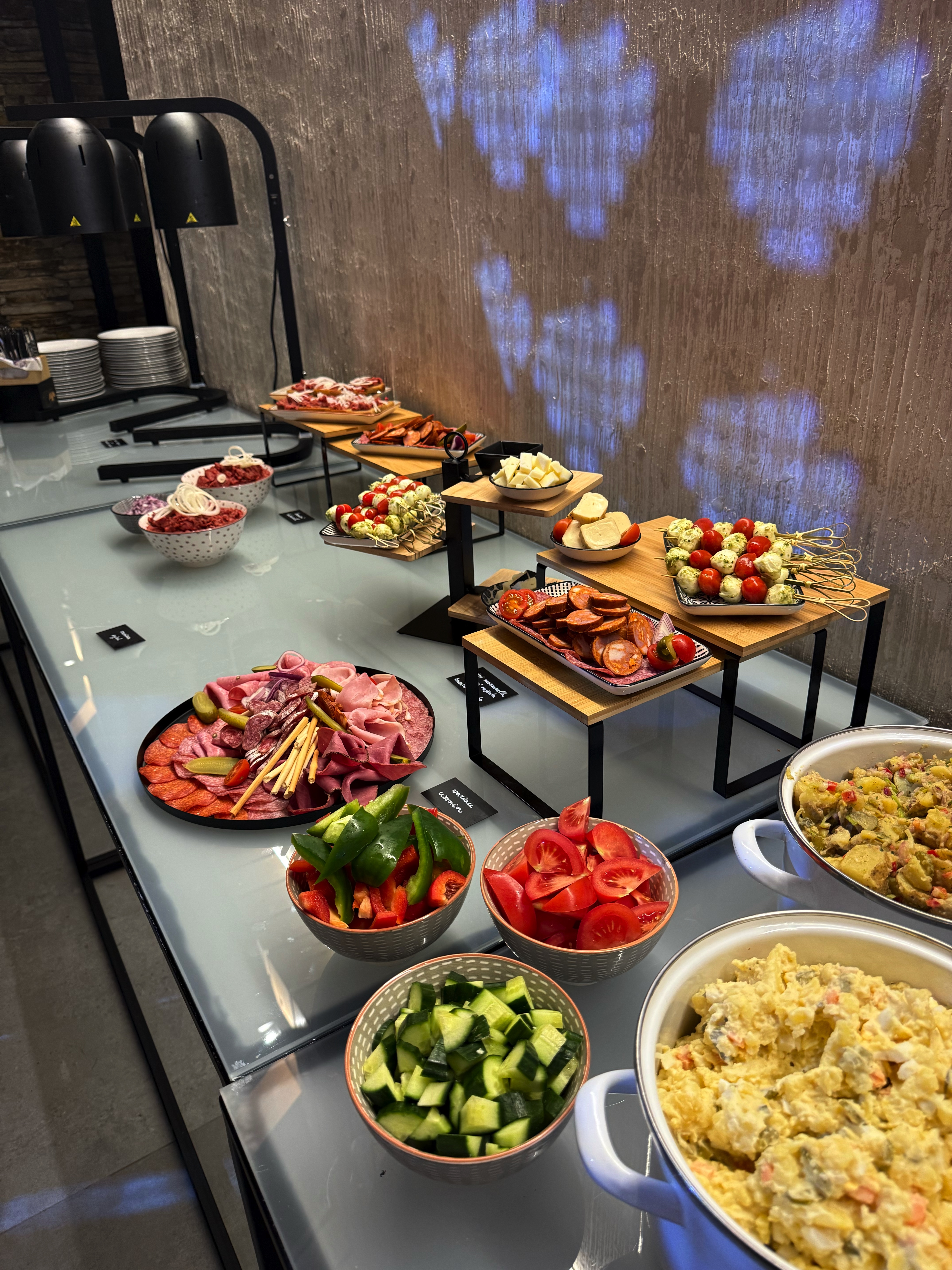 - doplňky (olivy, balkánský sýr, slanina, olivový olej, dip, bylinková foccacia)