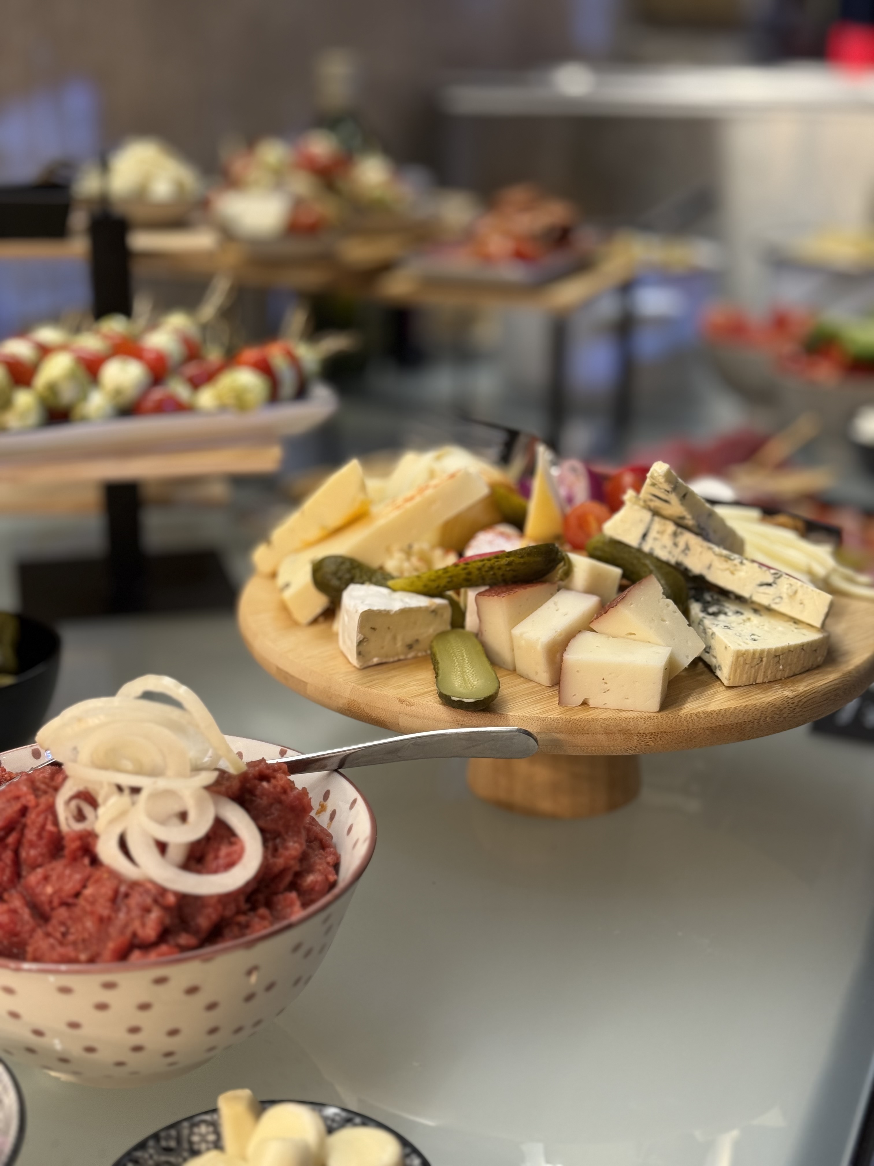 - Variace kuřecích a vepřových řízečků, kyselé okurky/vídeňský a bramborový salátHovězí tatarák s opečeným česnekem a topinkami