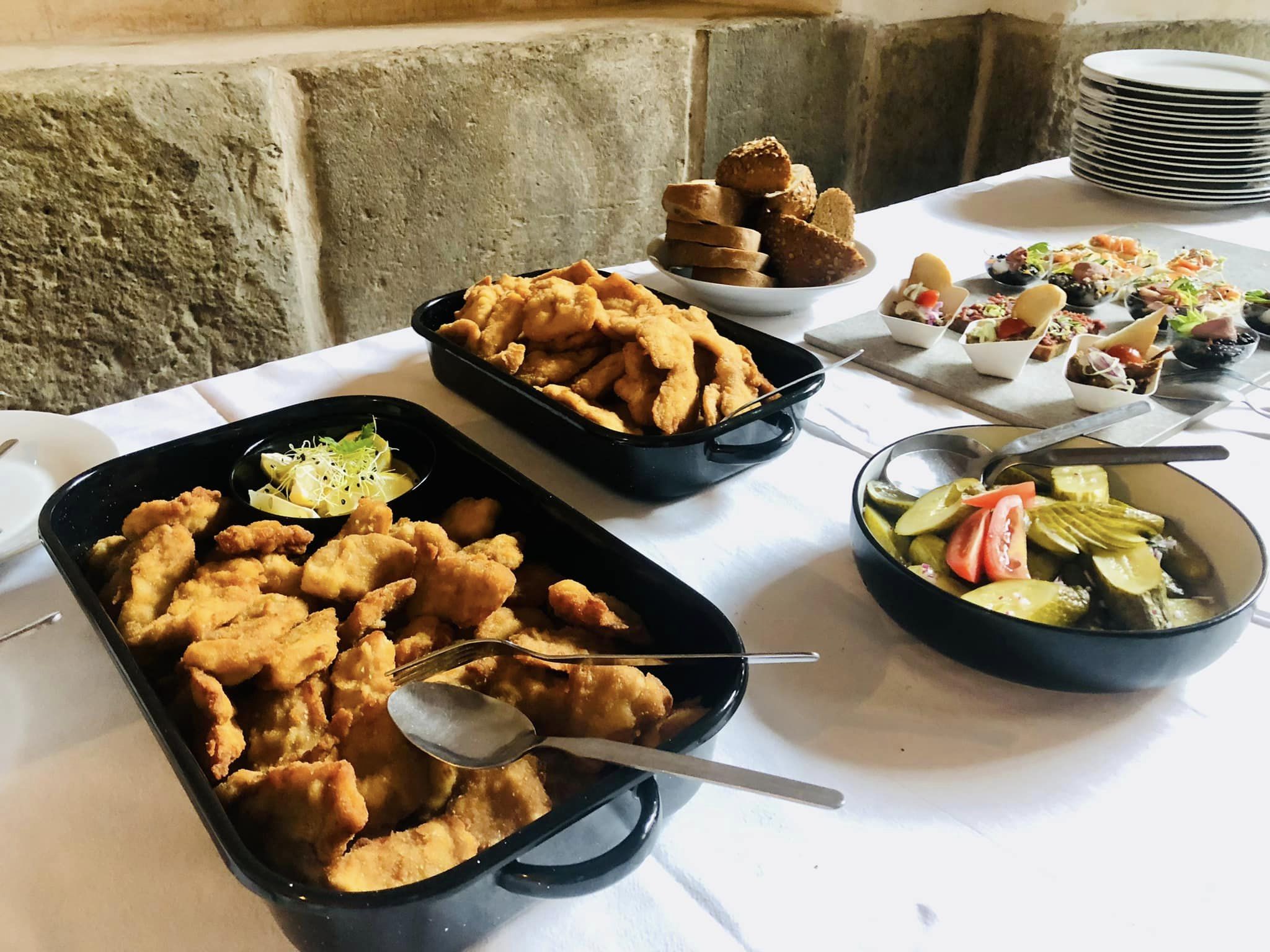 - Vepřová panenka s kuřecími prsíčky, pečená grilovaná zelenina, smetanové brambory